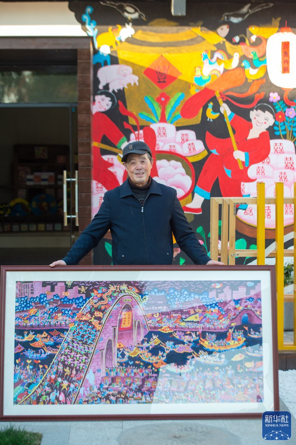 浙江省嘉兴市秀洲区油车港镇胜丰村村民张金泉与自己的画作《国泰民安》合影(2020年12月15日摄)。新华社记者 江汉 摄