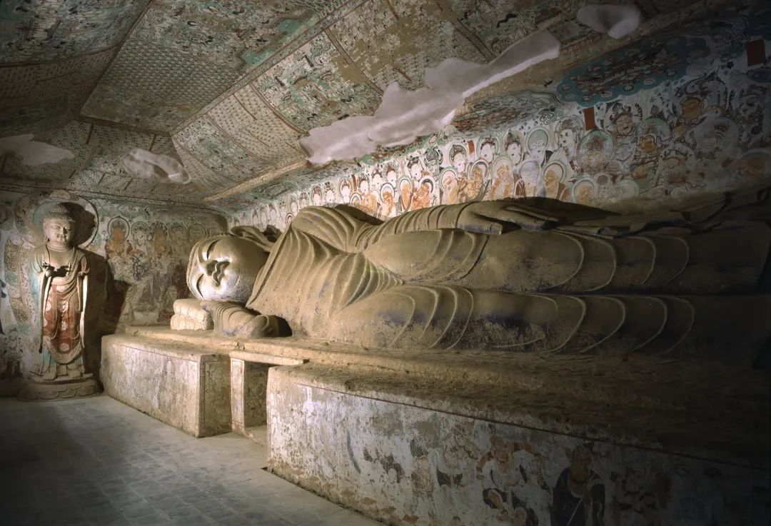 158窟,莫高窟著名的涅槃窟之一,左右侧壁分别绘十大弟子举哀图、各国王子举哀图,佛祖释迦牟尼安详侧卧,表现“寂灭为乐”的涅槃境界。