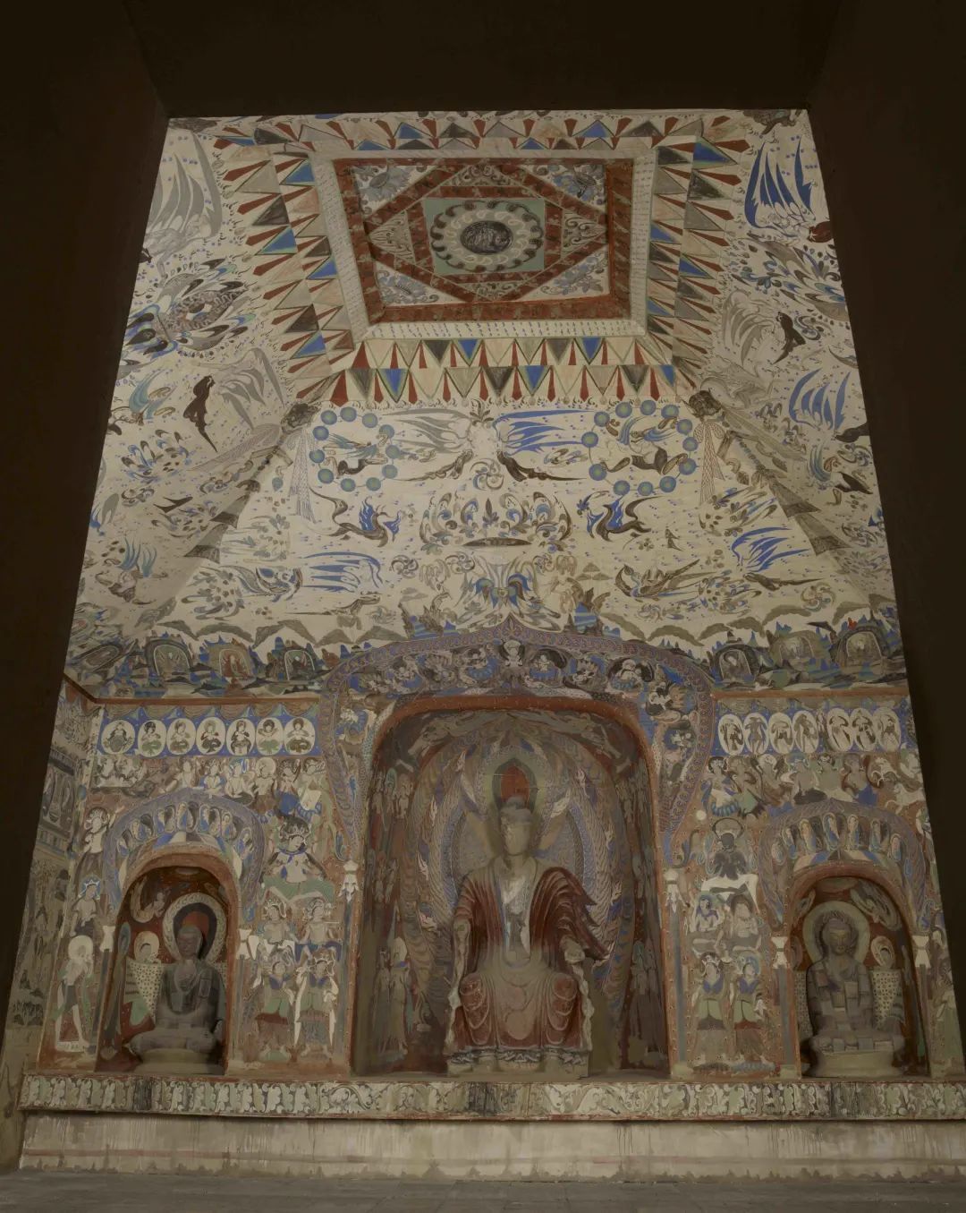 285窟,建于西魏大统四年(538),是莫高窟最早有确切开凿年代的洞窟。窟顶四披画东西方诸神,如飞天、力士、伏羲、女娲,交互杂呈,被誉为“中国的万神殿”。