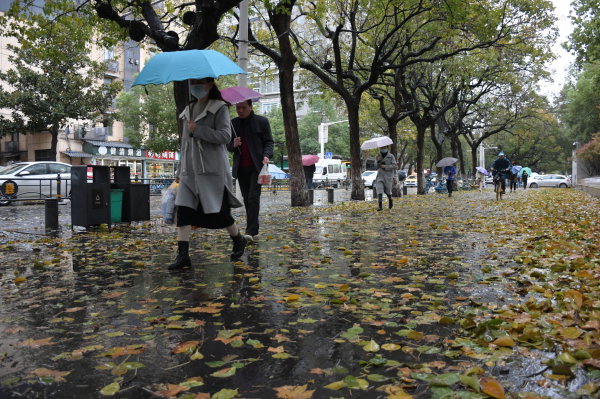 11月7日正值立冬,长江日报记者在崇仁路和宝丰街上看到,上班的市民打着雨伞顶着大风赶路,被大风吹落的树叶飘落一地,不少市民已经穿上了羽绒服,让每个人感受到初冬的寒意。 记者詹松 摄