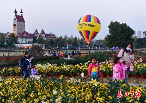 11月13日,蔡甸花博汇景区向日葵、百合、醉蝶花仍在盛开,众多游客携家带口徜徉花间。记者李永刚 摄