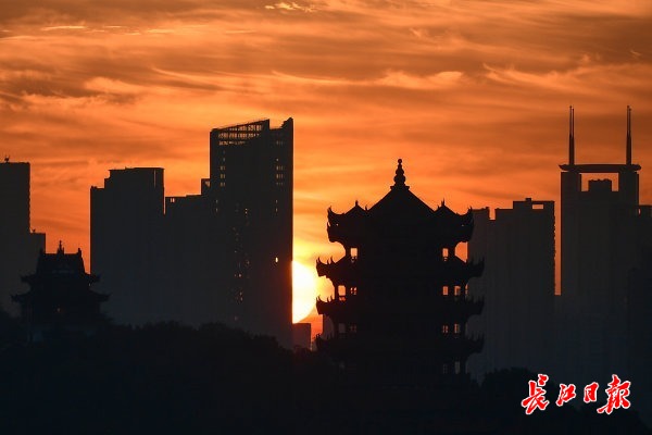 11月15日清晨6时50分,太阳穿过城市天际线,从黄鹤楼和后方高楼的间隙中冉冉升起,由于受大气折射影响,太阳幻化成“风火轮”一般挂在空中。长江日报记者史伟 摄