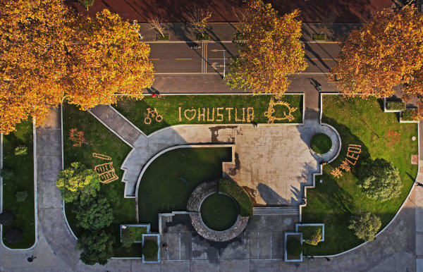 2021年11月25日,华中科技大学校园里,散落的银杏树叶被摆放出“I ❤HUST LIB”(我爱华中大图书馆)、“1037森林”(珞喻路1037号森林大学)字样,以及单车、书笔、野猪的图案,学子们用自然的语言向母校创意表白。 长江日报记者苗剑 摄
