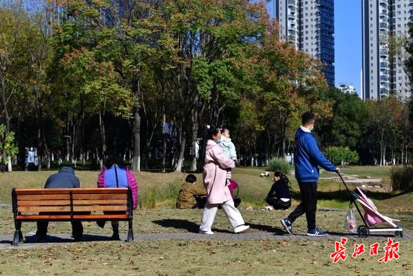 11月30日,后襄河公园,周边办公楼里的上班族和附近居民纷纷前来晒太阳、散步,欣赏蓝天下的美景。 长江日报记者李永刚 摄