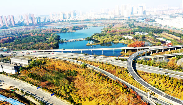 12月5日,蓝天白云,无人机在200米高空中俯瞰三环线沿线的张毕湖、硚孝高速公路及武孝城际铁路金银潭站附近,一幅幅秋日景象美不胜收。长江日报记者金振强 摄