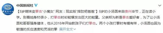 辗转腾挪,灵活攻守,一套连招之后自己的亲哥都傻眼了。近日,贵州一名年仅8岁的小女孩与哥哥练拳的视频在网上火了。许多网友看过这个视频之后表示:“这不就是现实版的《摔跤吧爸爸》吗,小姑娘真的是太厉害了。”