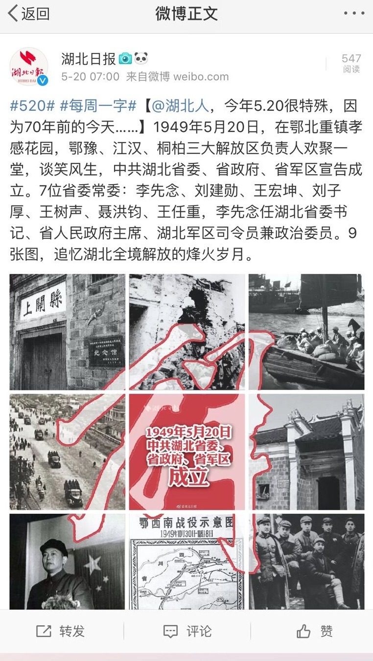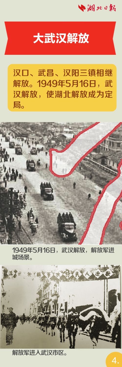 1949年5月20日,在鄂北重镇孝感花园,鄂豫、江汉、桐柏三大解放区负责人欢聚一堂,谈笑风生,中共湖北省委、省政府、省军区宣告成立。7位省委常委:李先念、刘建勋、王宏坤、刘子厚、王树声、聂洪钧、王任重,李先念任湖北省委书记、省人民政府主席、湖北军区司令员兼政治委员。9张图,追忆湖北全境解放的烽火岁月。