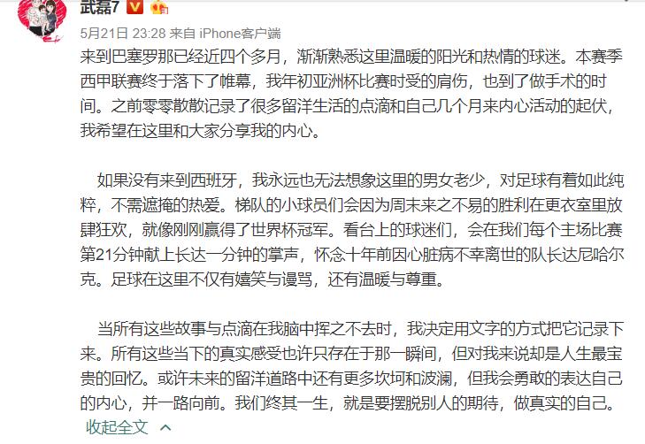 5月21日晚,武磊在社交媒体发文,动情总结了自己留洋第一个赛季的经历和体会。