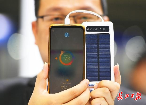 爱旭数字能源展示的太阳能手机充电器。 记者高勇 摄