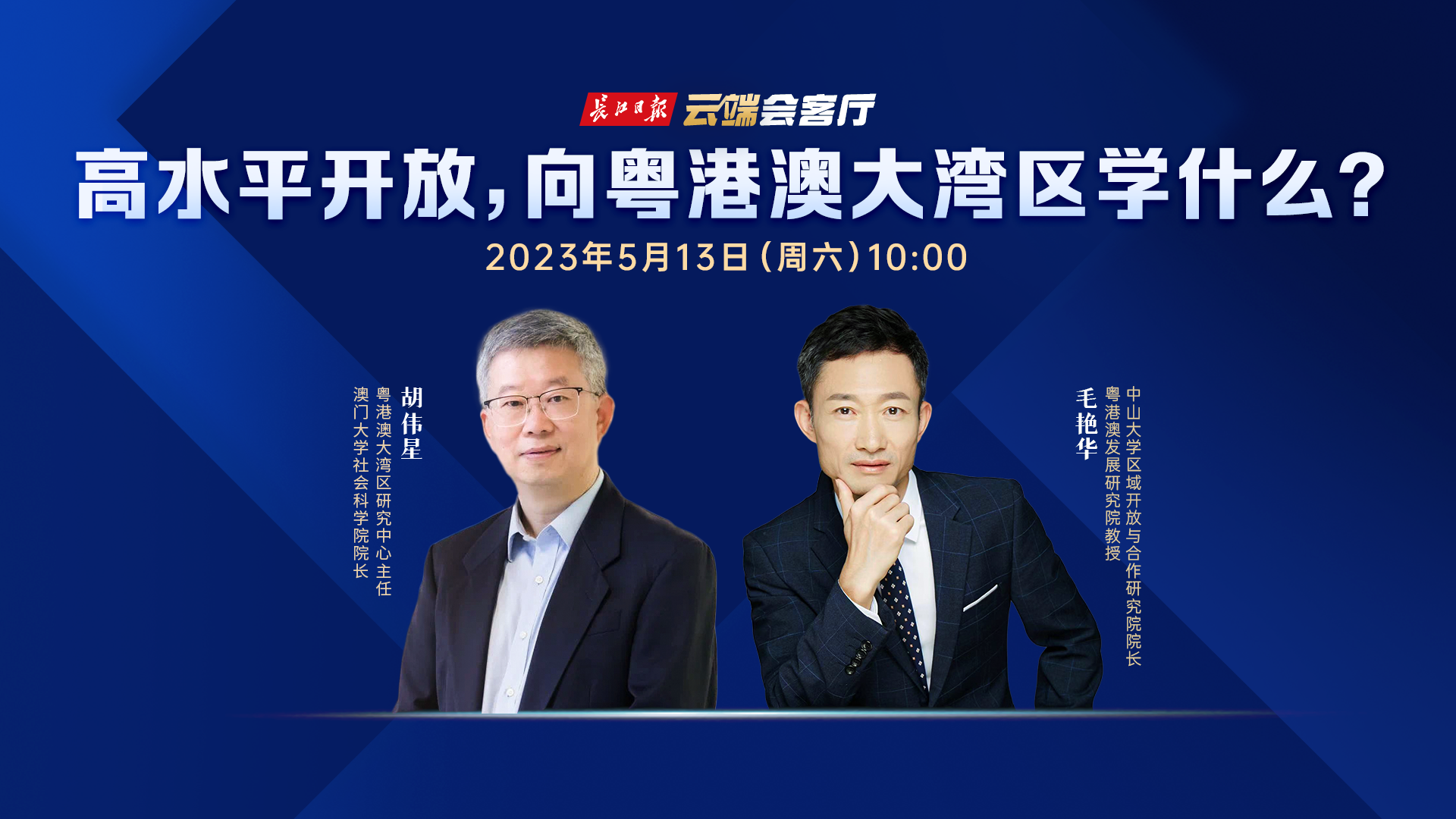 5月13日(本周六)上午10时,长江日报云端会客厅将围绕上述议题,邀请澳门大学社会科学院院长、粤港澳大湾区研究中心主任胡伟星,中山大学区域开放与合作研究院院长、粤港澳发展研究院教授毛艳华两位资深学者做客直播间,展开深入探讨与分享。