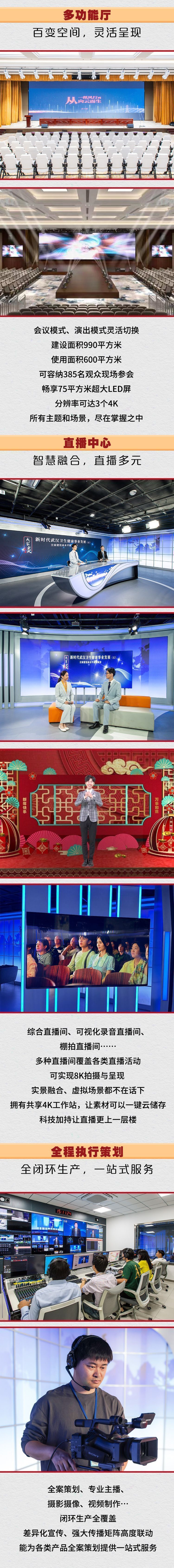 长江演播中心位于长江日报报业集团内,总规划面积4000平方米。一期项目2360平方米,今年1月正式投入运行。项目由多功能演播会议厅、综合直播间、可视化广播间、棚拍直播间、网红直播间、导播控制间、待播讨论区、共享4K工作站/云媒资库等10多个功能区组成。