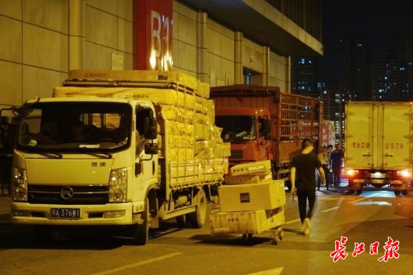 场馆外排队等待进入的大货车。长江日报记者秦璟 摄