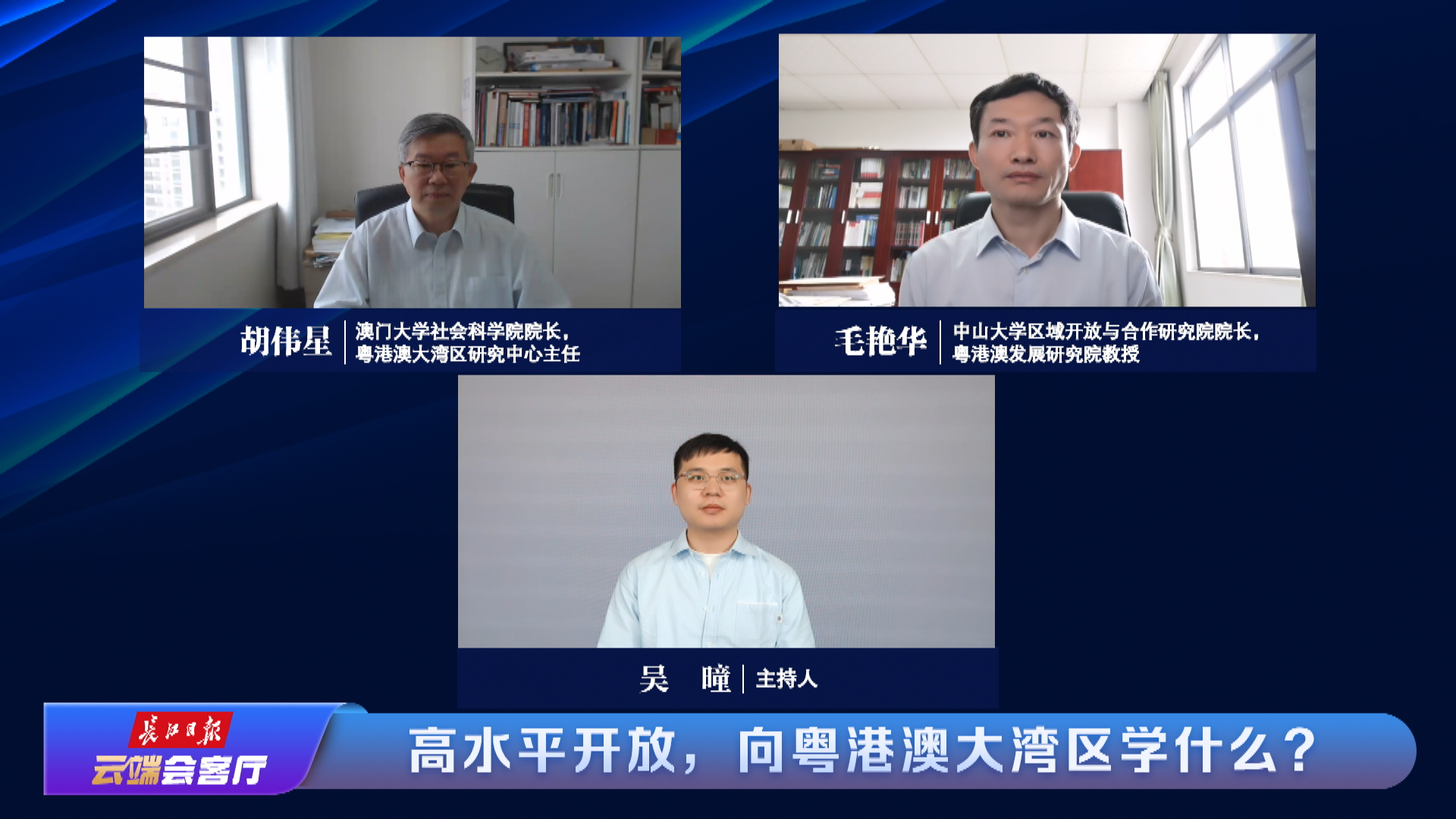 如今,粤港澳大湾区发展的显著成果,正成为世界观察中国高质量发展的重要窗口。近日,长江日报云端会客厅邀请澳门大学社会科学学院院长胡伟星和中山大学区域开放与合作研究院院长毛艳华,分享交流粤港澳大湾区服务国家对外开放的先进经验,并为武汉加快打造内陆开放新高地提出建议。