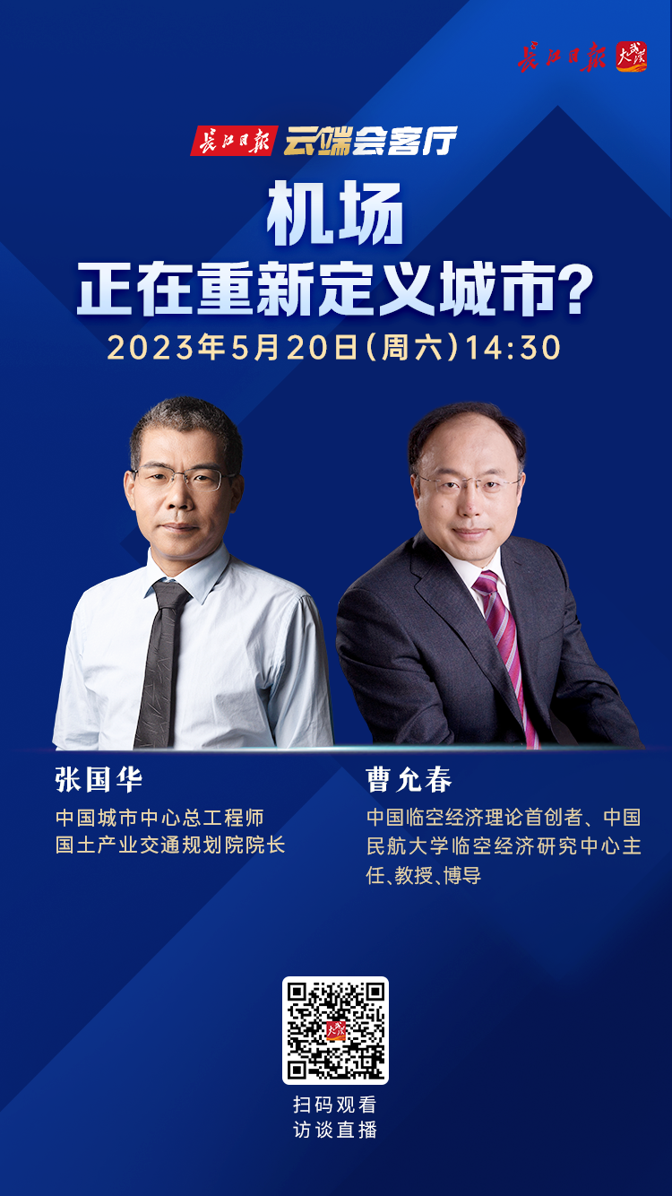 5月20日(本周六)14:30,长江日报云端会客厅将围绕以上话题,邀请中国城市中心总工程师、国土产业交通规划院院长张国华,中国临空经济理论首创者、中国民航大学临空经济研究中心主任曹允春两位专业人士做客直播间,展开深度分享与讨论。