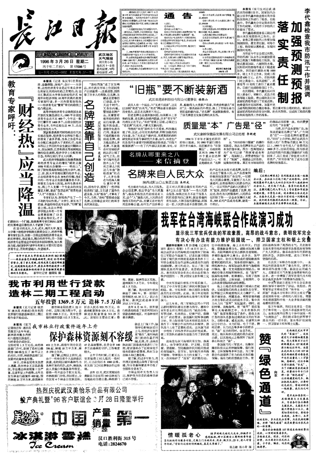 1996年3月26日,《长江日报》头版版面。