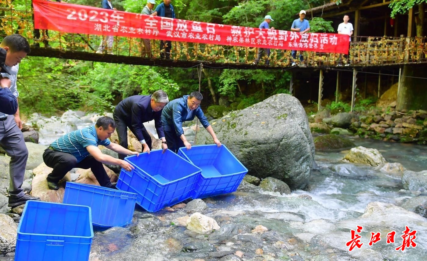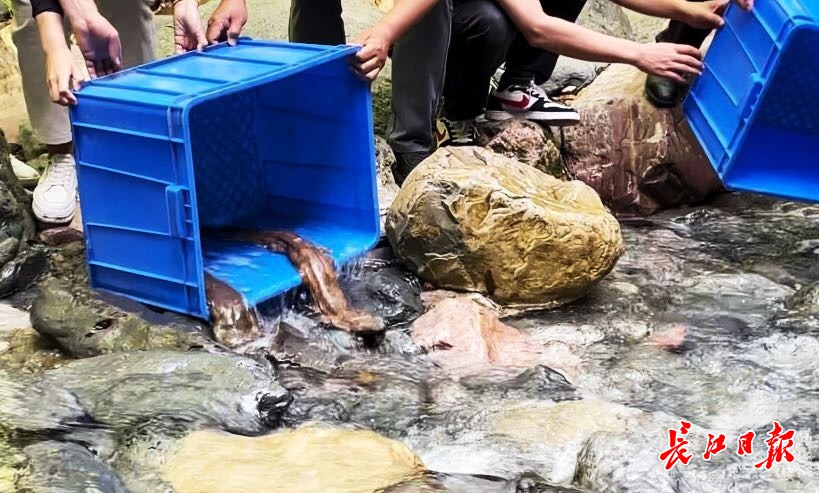 长江日报大武汉客户端6月9日讯 今日上午,30尾大鲵(娃娃鱼)在神农架林区一条溪流中被野外放归。这里的野外环境很适合娃娃鱼生存,本来也是娃娃鱼的故乡之一。