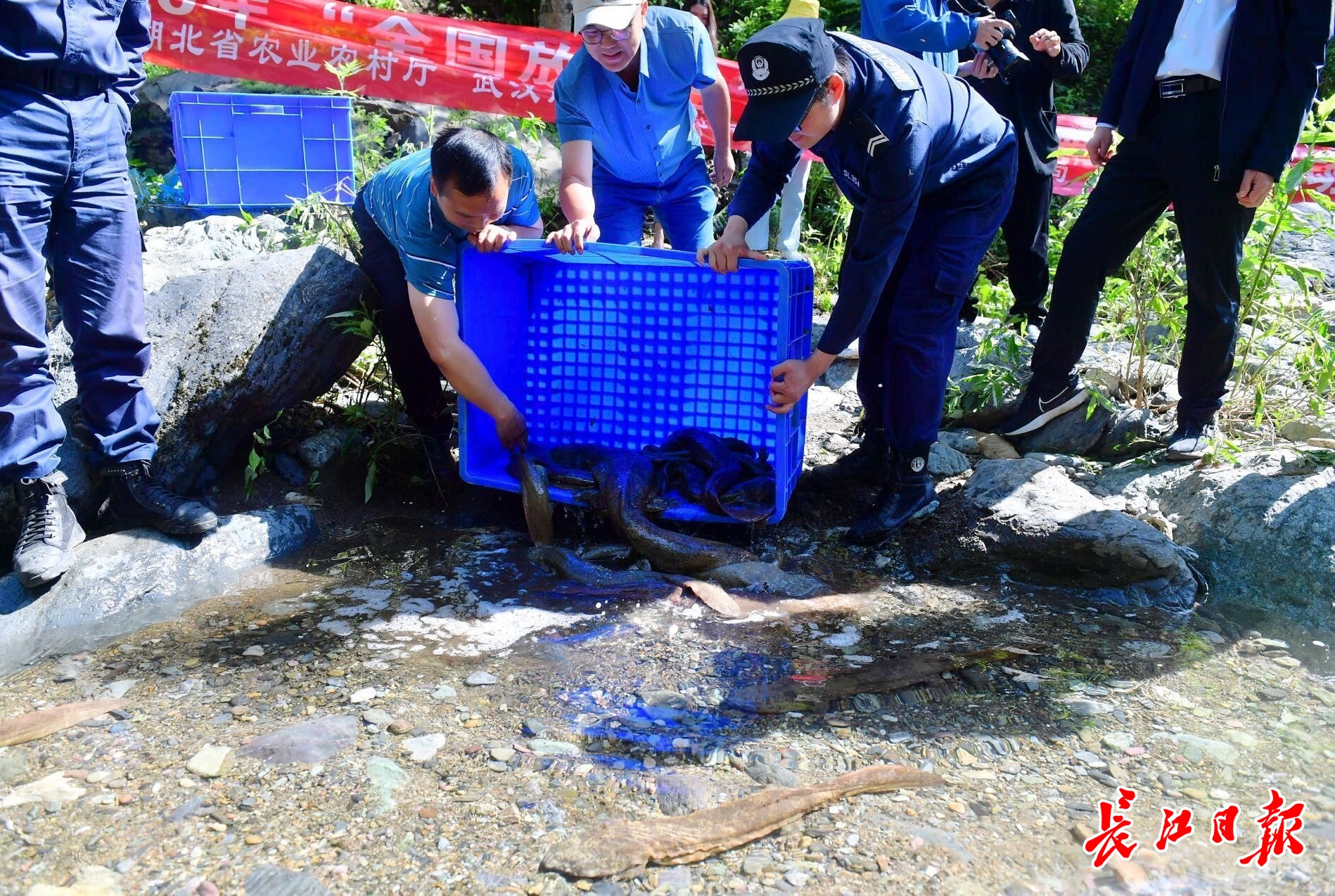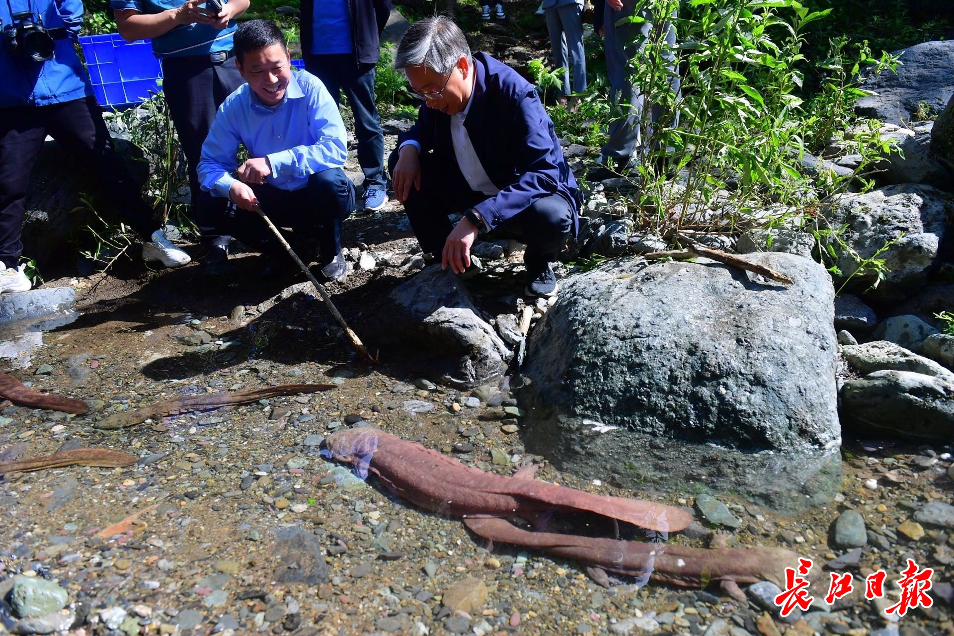 6月9日上午9时,长江日报记者现场见证,从武汉运来的30尾大鲵(娃娃鱼)在神农架一条溪流的两处放归点放归自然。 长江日报特派记者 刘斌 摄