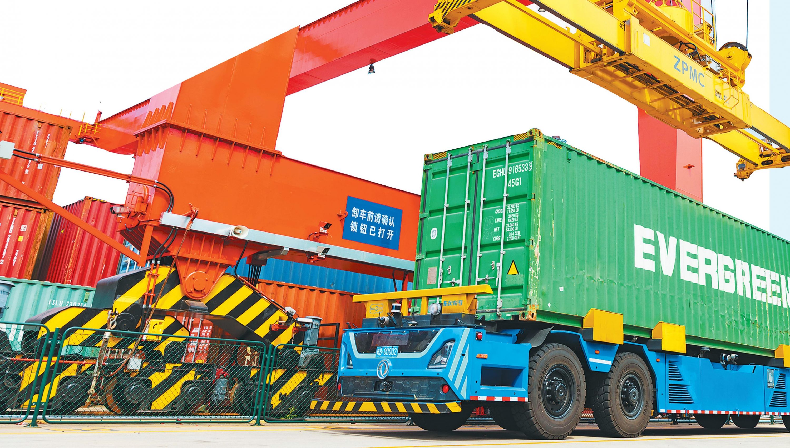 6月8日,湖北港口集团阳逻港二期集装箱堆场,无人驾驶集装箱搬运车正在作业。至此,3辆智能无人驾驶水平运输车先后在阳逻港二期码头投入试运营,通过5G网络通信,实时接收并精准执行运输指令。阳逻港加快推进传统集装箱码头全智能化转型升级,今年实现了“智慧港口2.0”模式运营。图/湖北日报