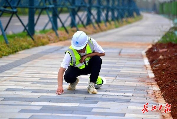 “道路两旁种植了银杏树,中间绿化带种上了香樟树,到了秋天这条路将变得金灿灿的,一定很美。”项目生产负责人袁强明告诉记者,该道路不仅绿化美观,而且整条道路建设融合了海绵城市设计理念。记者发现,人行步道上虽然刚下过雨,地砖没有明显积水痕迹。“这种砖就像海绵一样,能够在下雨时快速渗透,做到大雨不积水、小雨不湿脚。”袁强明解释,作为融入海绵城市设计的道路,步行道全部采用透水材料铺装、下沉式绿地,整条道路采用最新的城市雨洪管理观念,应对雨水带来的自然灾害具有很好的“弹性”。现场记者做了个小实验,在地砖上倒下半瓶纯净水后,10秒不到水便融入地砖内,表面仅剩些水渍。