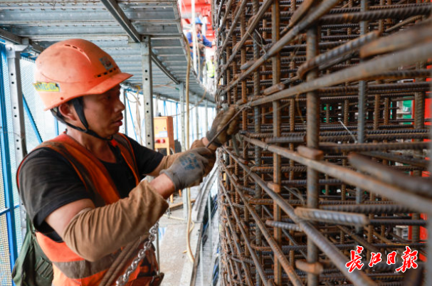 6月26日,汉口滨江国际商务区,武汉泰康金融中心项目上方,“身穿”蓝色防护网的建筑顶部仿似“戴”着一顶鲜艳的“红帽子”,那里便是全新一代“空中造楼机”的钢平台系统,工人们小小的身影在“红帽子”上穿梭,步履轻松。