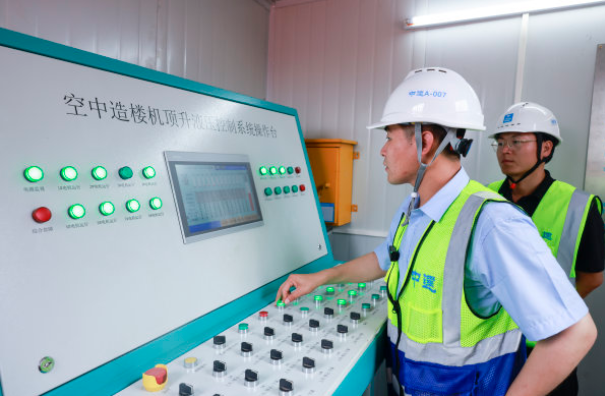 工作人员操控空中造楼机顶升液压控制系统。长江日报记者胡冬冬 摄