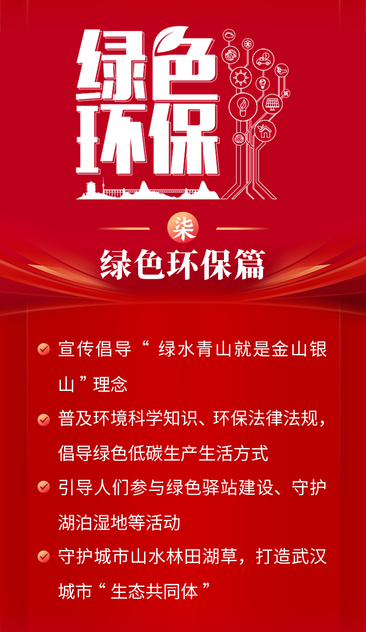 绿色环保篇主要是宣传倡导“绿水青山就是金山银山”理念,普及环境科学知识、环保法律法规,倡导绿色低碳生产生活方式,增强市民群众节能环保意识,引导人们参与绿色驿站建设、守护湖泊湿地等活动,自觉守护城市的山水林田湖草,共同打造好武汉城市“生态共同体”。