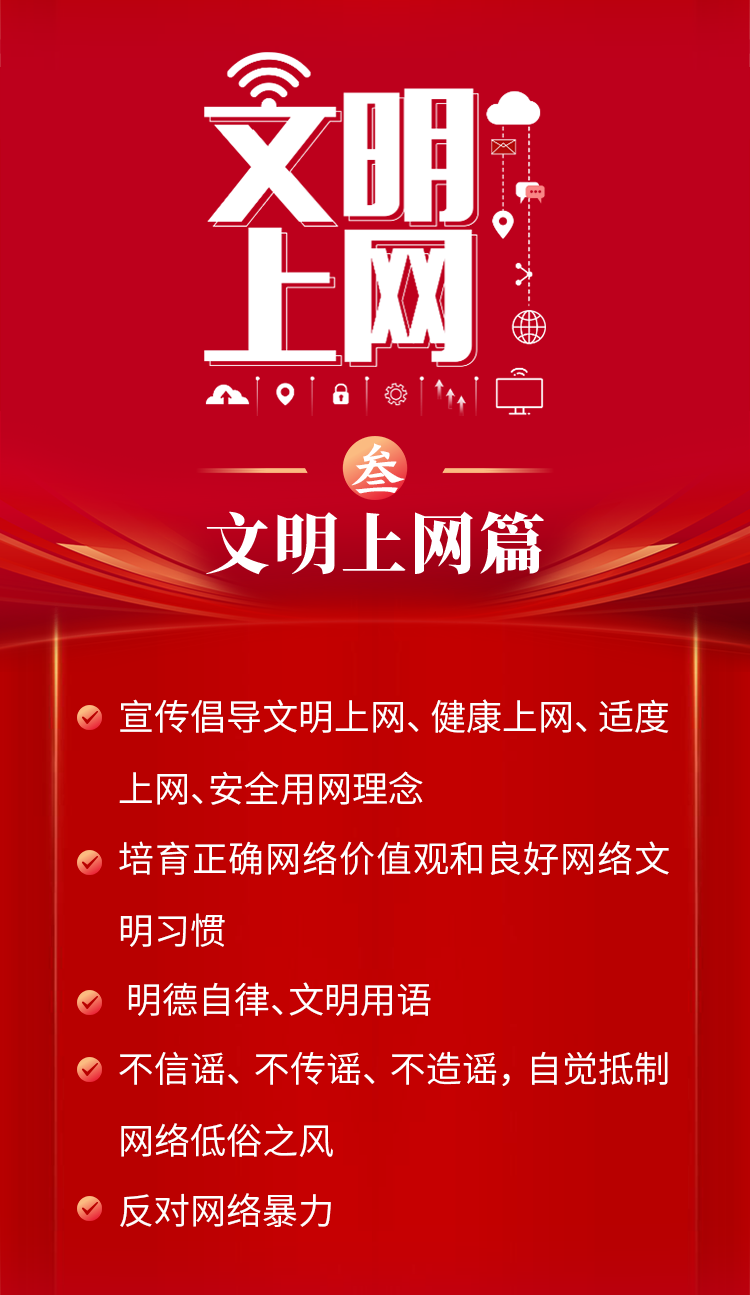 文明上网篇主要是宣传倡导文明上网、健康上网、适度上网、安全用网理念,引导市民培育正确网络价值观和良好网络文明习惯,明德自律、文明用语,不信谣、不传谣、不造谣,不制作和传播违法违规、伤风败俗的信息,自觉抵制网络低俗之风,反对网络暴力,共同净化网络环境,营造清朗网络空间,争做武汉好网民。