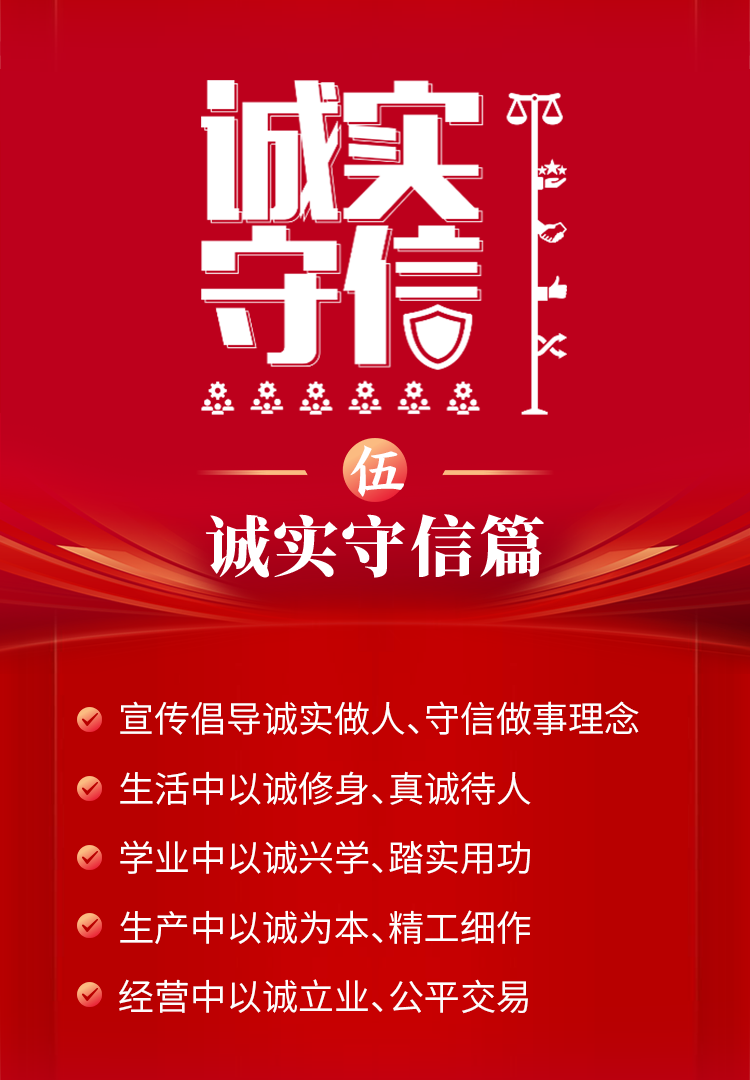 诚实守信篇主要是宣传倡导诚实做人、守信做事理念,引导市民爱护信用、履约重诺,树立正确义利观,在生活中以诚修身、真诚待人,反对虚情假意、背信弃义;在学业中以诚兴学、踏实用功,反对抄袭作弊、学术造假;在生产中以诚为本、精工细作,反对假冒伪劣、以次充好;在经营中以诚立业、公平交易,反对见利忘义、欺瞒诈骗,营造守信光荣、失信可耻的社会氛围。