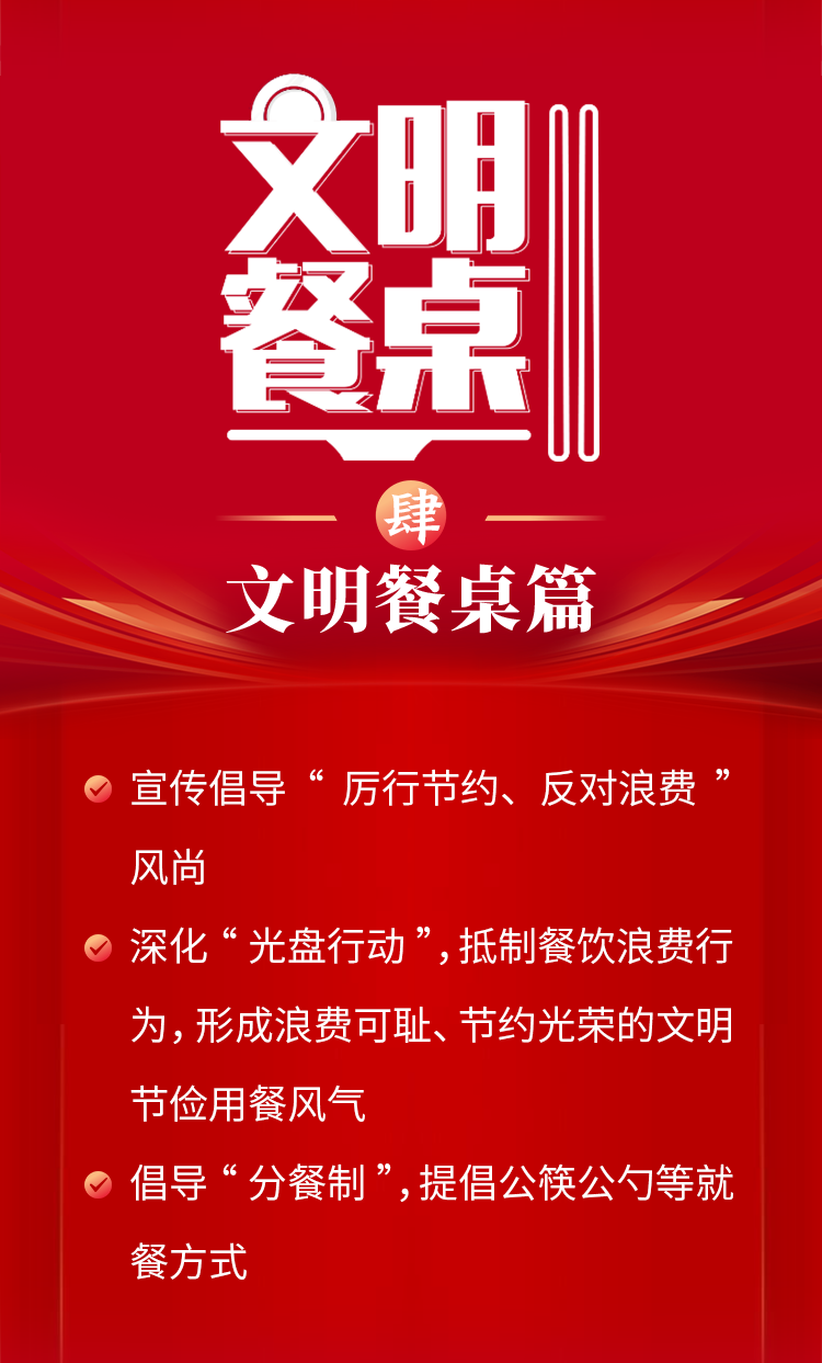 文明餐桌篇主要是宣传倡导“厉行节约、反对浪费”风尚,深化“光盘行动”,引导市民转变消费观念、养成理性消费习惯,自觉抵制餐饮浪费行为,形成浪费可耻、节约光荣的文明节俭用餐风气。倡导“分餐制”,提倡公筷公勺等就餐方式,培养文明健康用餐习惯。