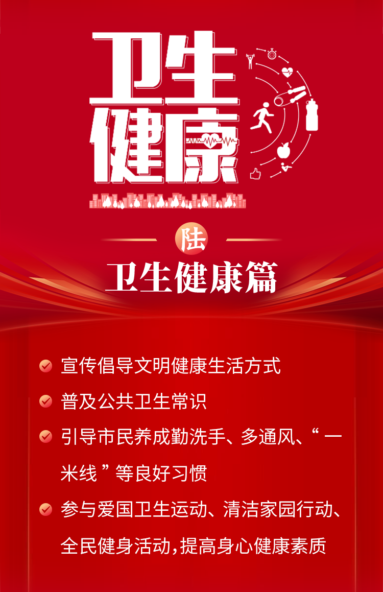 卫生健康篇主要是宣传倡导文明健康生活方式,普及公共卫生常识,引导市民掌握传染病防控知识和个人防护措施,养成勤洗手、多通风、“一米线”等良好习惯,维护个人卫生、饮食卫生、环境卫生,参与爱国卫生运动、清洁家园行动、全民健身活动,提高身心健康素质,共同构建干净整洁、规范有序、文明健康的生活环境。
