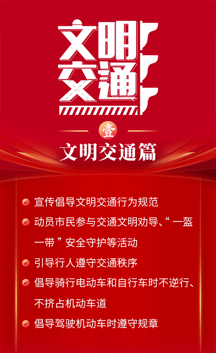 文明交通篇主要是宣传倡导文明交通行为规范,动员市民参与交通文明劝导、礼让斑马线、文明礼仪进车厢、“一盔一带”安全守护等活动,引导行人遵守交通秩序,走斑马线,不闯红灯等,倡导骑行电动车和自行车时不逆行、不挤占机动车道、不乱穿越、不乱停乱放,倡导驾驶机动车时遵规章、不插队、不加塞、不开斗气车、不车窗抛物,营造文明出行的良好氛围。