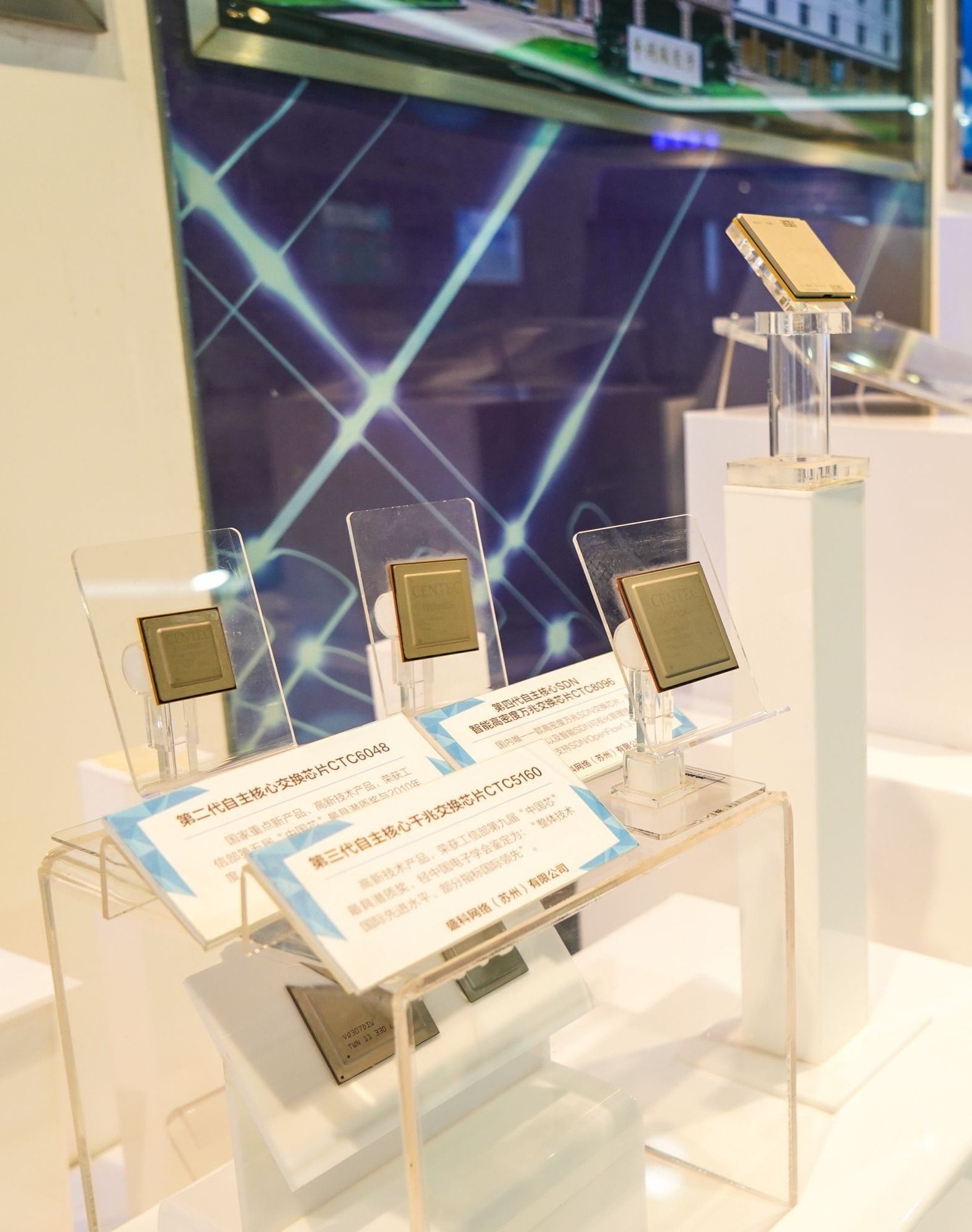 江苏省产业技术研究院产业创新发展馆内展示的各种自主核心芯片。新华社记者李博 摄