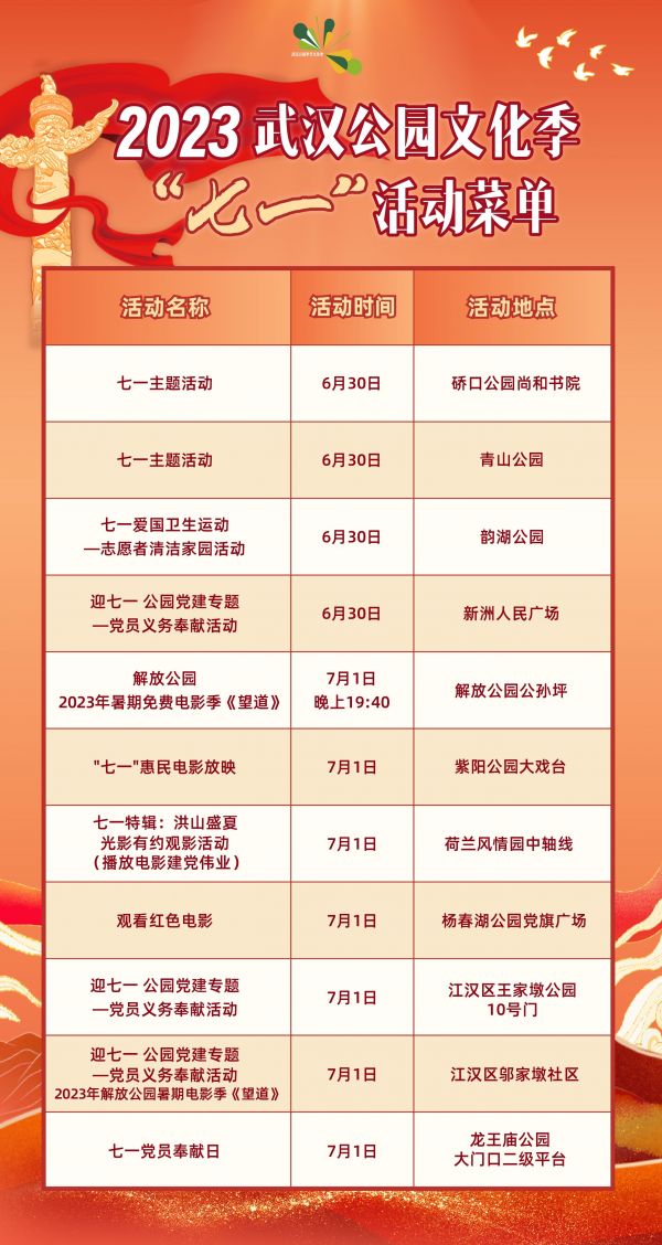 “七一”当天,解放公园在公孙坪、紫阳公园在大戏台、关山荷兰风情园在园内中轴线、杨春湖公园在红旗广场,将举办露天观影活动,丰富市民生活;江汉区王家墩公园、龙王庙公园、后襄河公园将举办植物医生、清洁家园等志愿服务活动,惠及民生。