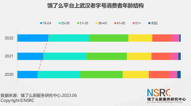 报告称,武汉的餐饮老字号平均年龄已超过100岁,而数字化平台的主力消费人群是Z世代,18~35岁用户群体占比超过70%。从武汉老字号客户群体年龄结构看,2022年35岁以下占比68%,比2020年上升4个百分点;其中18~24岁占比19%,比2020年上升7个百分点。