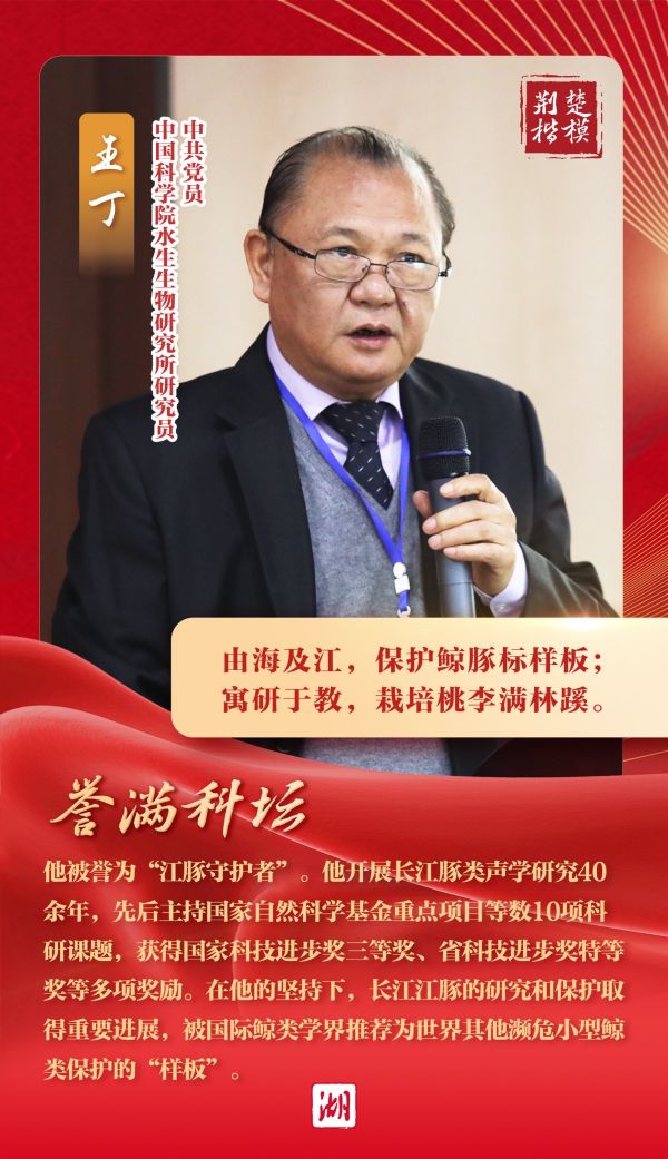 王丁是中国科学院水生生物研究所研究员,他开展长江豚类声学研究40余年,被誉为“江豚守护者”。他先后主持国家自然科学基金重点项目等数10项科研课题,获得国家科技进步奖三等奖等多项奖励。在他的坚持下,长江江豚的研究和保护取得重要进展,被国际鲸类学界推荐为世界其他濒危小型鲸类保护的“样板”。