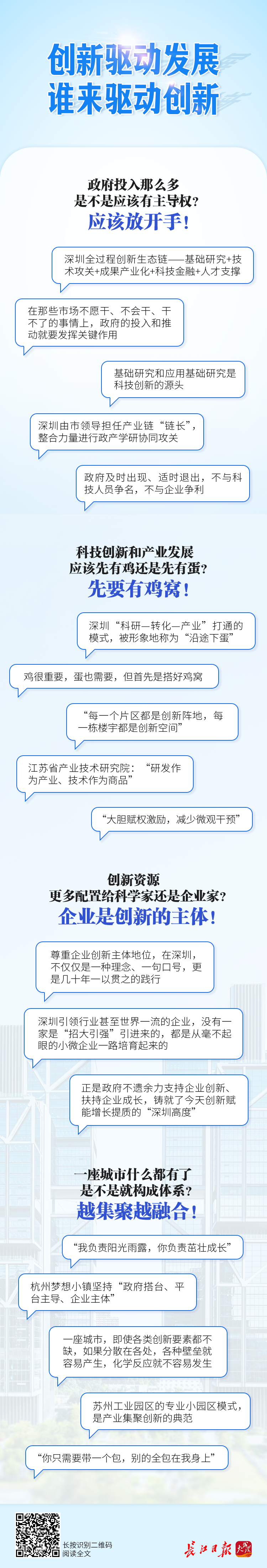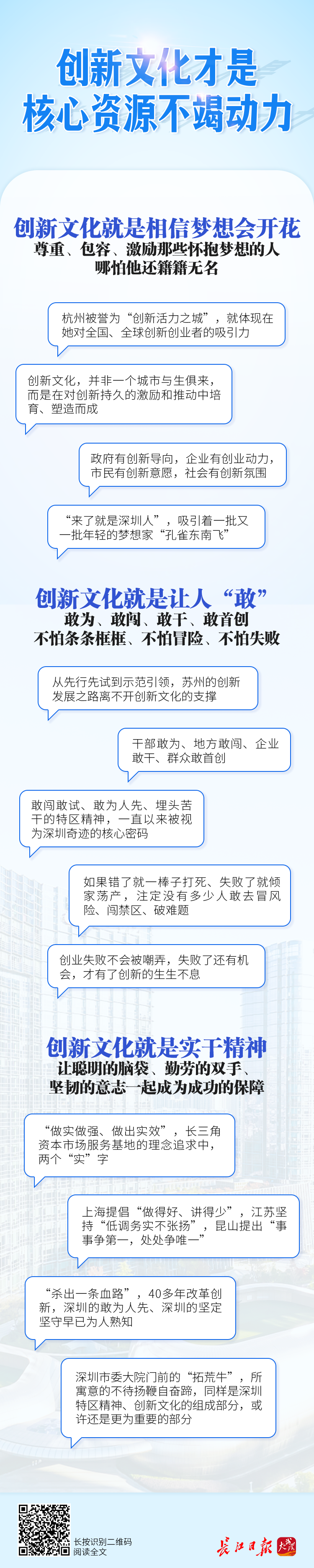如何学习长三角大湾区?核心要点来了! ©原创 2023-07-04 13:56 0 6月25日至29日 长江日报连续刊发 “长三角和大湾区 高质量发展的启示”系列报道 ● 展现先进城市坚持创新驱动发展、闯过产业转型之关、走上高质量发展之路的生动实践; ● 记录先进城市以“十年磨一剑”之功推动科技创新和产业升级的坚守和定力; ● 探寻先进城市将有为政府和有效市场相结合、打造热带雨林式创新生态的积极作为; ● 解读先进城市思想解放、敢闯敢试,宽容失败、支持冒险,坚持不懈、久久为功的创新文化。 (策划:张颖 整理:喻鑫 设计:胡欣) 【编辑:张靖】