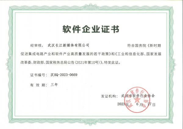 长江日报大武汉客户端7月4日讯(记者王允祺)近日,武汉市软件行业协会公布武汉市2023年6月全市“双软”(软件企业认定和软件产品登记)认证名单,长江网运营主体武汉长江新媒体有限公司获得由武汉市软件行业协会颁发的《软件企业证书》,公司自主研发的“江豚”全媒体发布系统(OCMS)V1.0获《软件产品证书》。