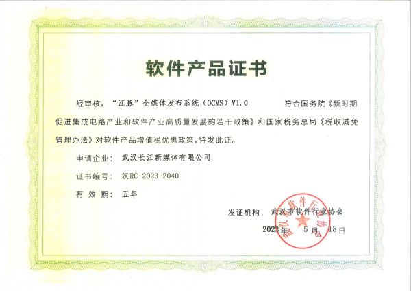 武汉长江新媒体有限公司自主研发的“江豚”全媒体发布系统(OCMS)V1.0获《软件产品证书》。