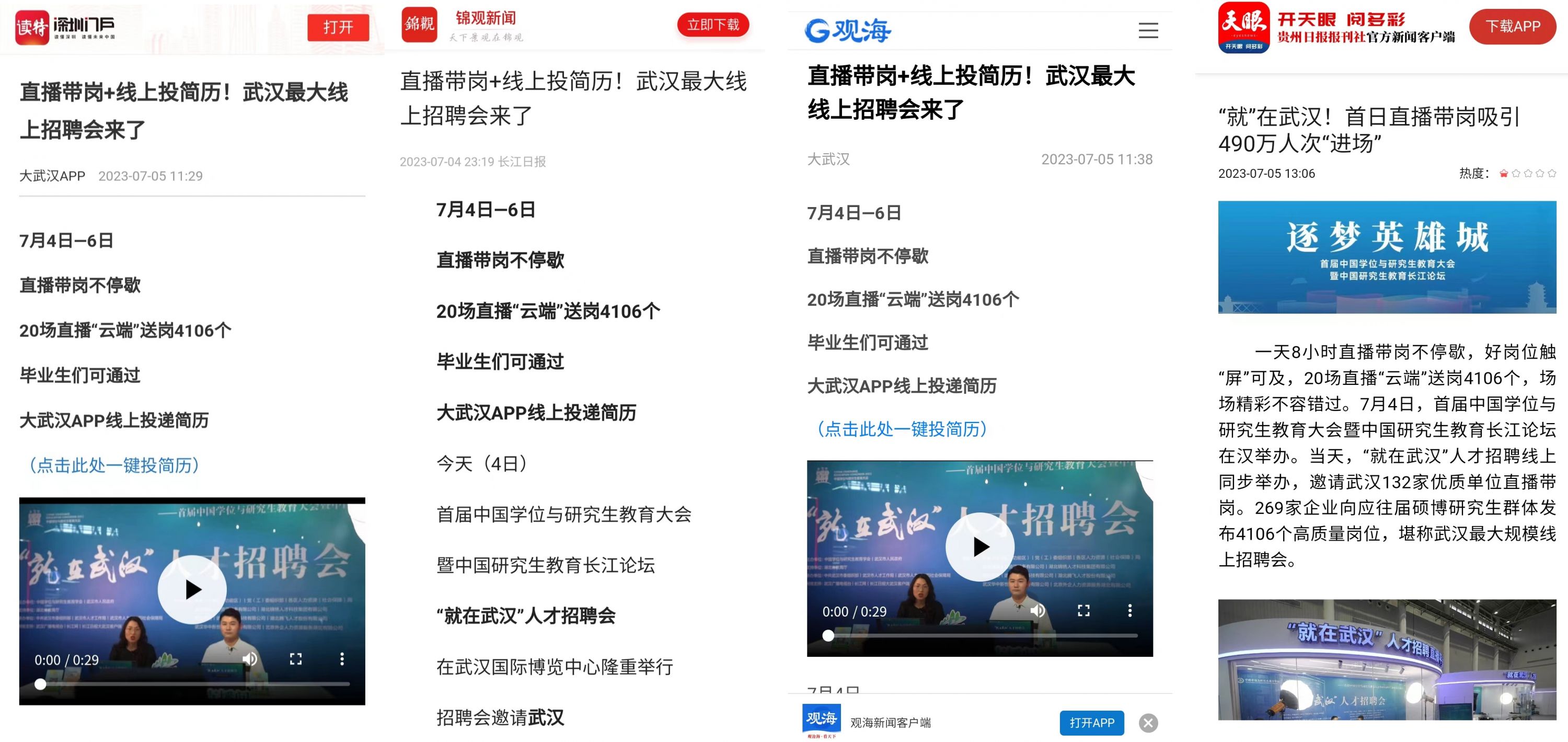 7月5日,读特新闻、广州日报、华龙网、锦观新闻、观海新闻、沈阳日报、沈阳发布、杭州新闻、紫金山新闻、西安日报、长春新闻网、天眼新闻、甬派新闻等13家主流媒体联动刊发报道《直播带岗+线上投简历!武汉最大线上招聘会来了》,介绍了招聘会直播的盛况:平均每场直播超60万学子接踵而至,招聘会直播间不少企业是武汉“965”产业重点单位,企业优秀硕博研究生代表还分享了个人求职经验和在汉工作感受,贴心的“职场加油包”获得了毕业生们的大力点赞。