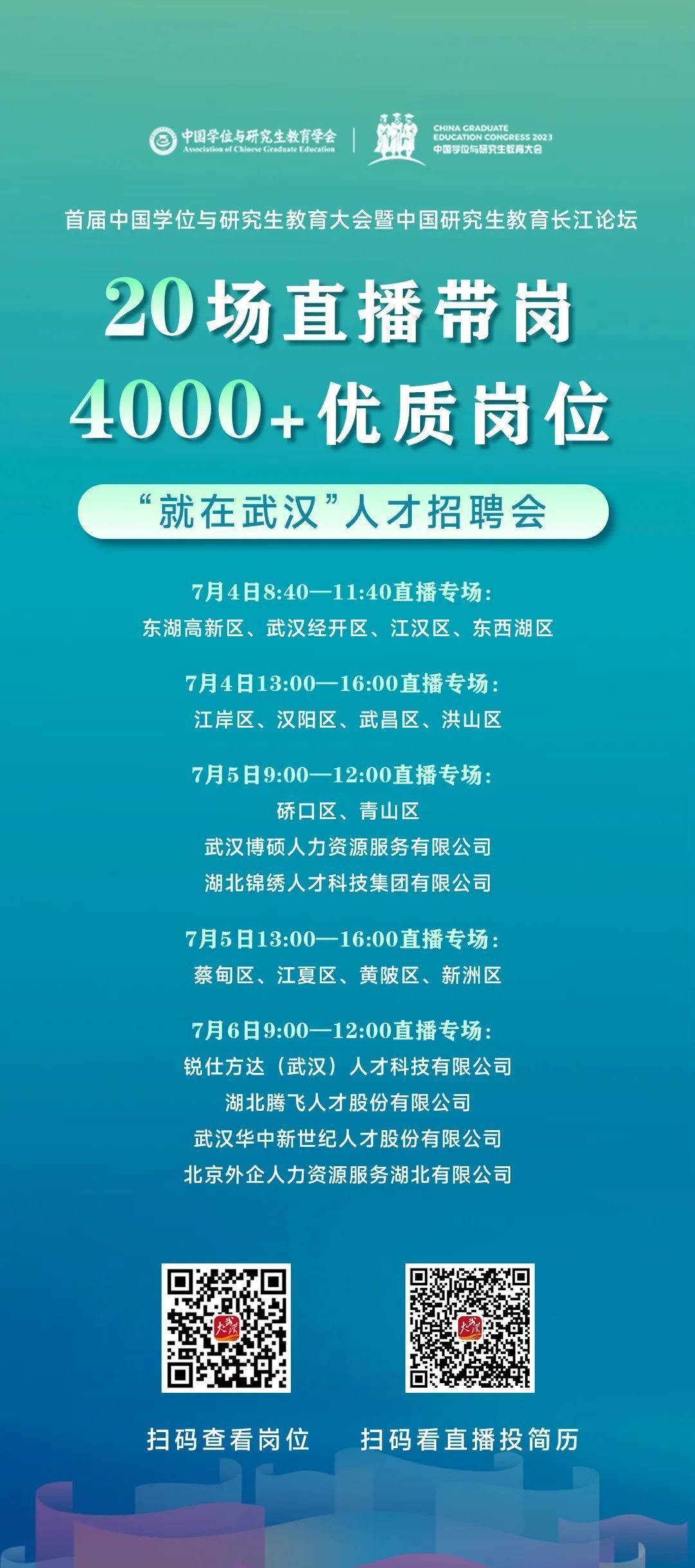 7月4日,首届中国学位与研究生教育大会暨中国研究生教育长江论坛在汉开幕,同期,武汉市举办“就在武汉”人才招聘会,4日至6日3天内举办20场直播带岗,269家企业向应往届硕博研究生群体发布4106个高质量岗位,堪称武汉最大规模线上招聘会,受到全国媒体关注。大武汉客户端同步直播,同时推出在线投递简历功能,备受求职者喜爱。
