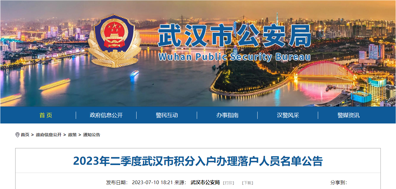 根据《武汉市积分入户管理办法(2022年版)》规定,经积分申请、审核、公示、复核等工作程序,参加2023年二季度积分入户申请人员的总积分已经核定,共有1943名申请人员可办理落户(具体名单附后)。