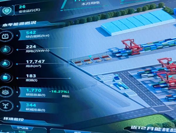 武汉港集装箱有限公司张丽红介绍,“武港集箱综合能源管理平台”是以武港集箱港区3D视角模型为基础,运用领先的物联采集、数字孪生等技术,打造电、水、油为一体的能源管家体系,可自动采集计量电能,对工艺流程、生产设备设施的能耗具备概况汇总、设备监测监控、能耗分析、能耗报表等管理功能。该平台于2023年6月12日正式上线,目前已实现对阳逻港区设备、办公楼、路灯等重点区域的用电能耗监测。