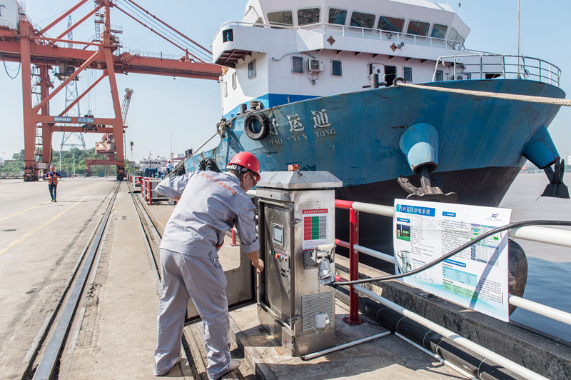 7月11日上午9时,在阳逻港二期码头,“鑫科6”货轮进港停泊,船长指挥船员对接码头岸电箱后,阳逻港二期工程部人员立即下达岸电对接指令。“货轮电力接通了吗?”“电压稳定,可以关闭发动机!”船长一声令下:“停机!”货轮依旧灯火通明,却不再冒黑烟,宁静的港湾没有了昔日的柴油味。