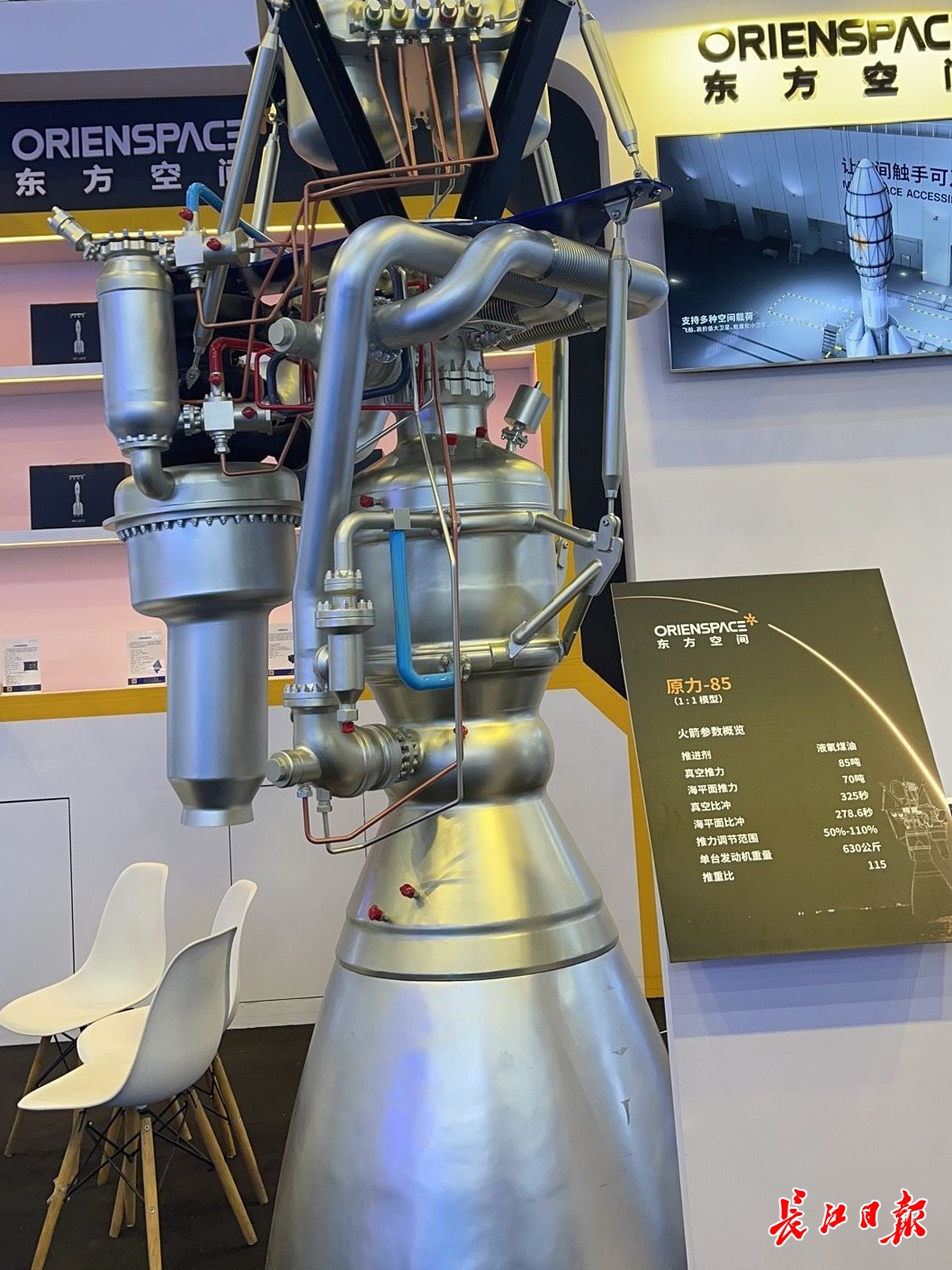 在东方空间展台前,记者看到一个比人还高几个头的“大家伙”。这家总部位于山东的企业专注于运载火箭设计制造。东方空间营销负责人何雪冰介绍:“这一款是东方空间自研的‘原力-85’百吨级液氧煤油火箭发动机,2025年就将投入使用。”