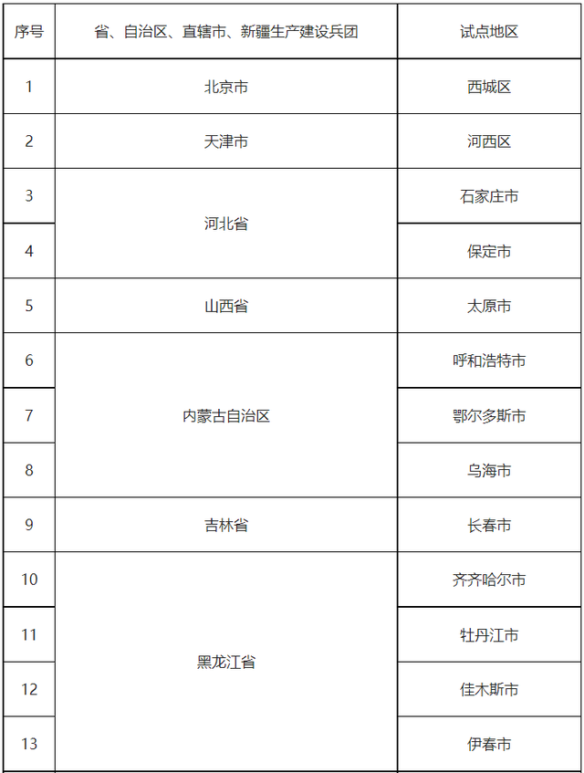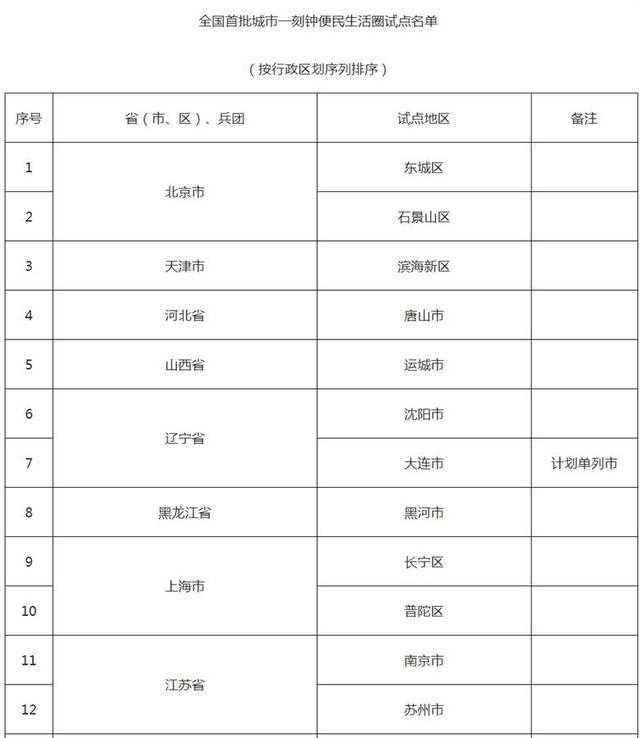 全国第一批城市一刻钟便民生活圈试点名单(按行政区划序列排序):