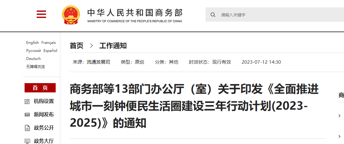 商务部等13部门办公厅(室)关于印发《全面推进城市一刻钟便民生活圈建设三年行动计划(2023-2025)》的通知