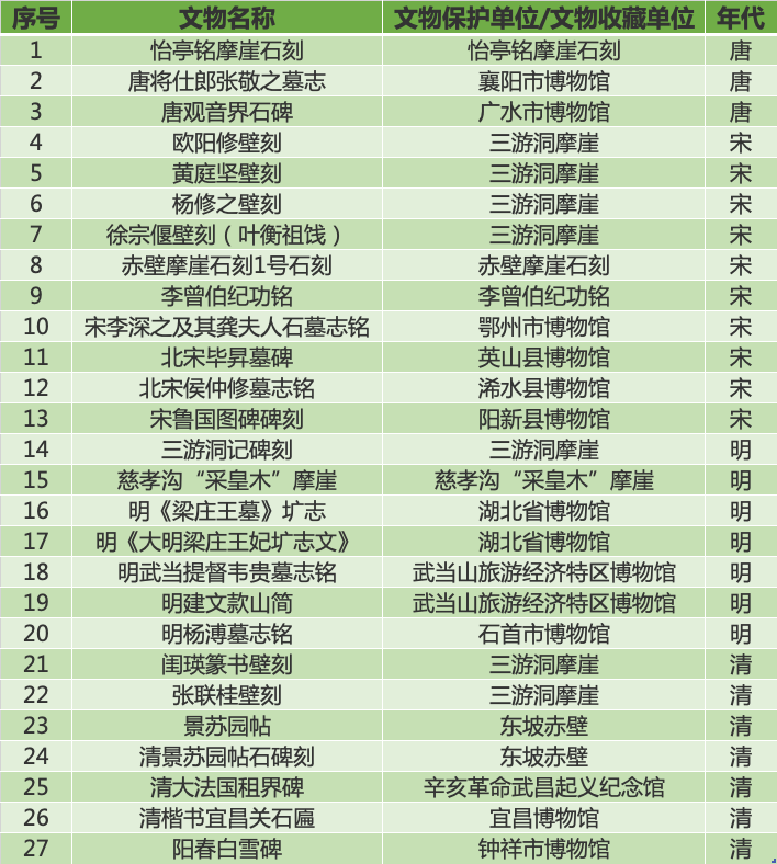 湖北有27通碑刻/摩崖石刻入选《名录》,其中3通刻成于唐代,10通刻成于宋代,刻成于明代和清代的各有7通。目前保管、收藏在武汉的有3通,分别是:刻成于明代的明《梁庄王墓》圹志和明《大明梁庄王妃圹志文》,保管、收藏在湖北省博物馆;刻成于清代的清大法国租界碑,保管、收藏在辛亥革命武昌起义纪念馆。