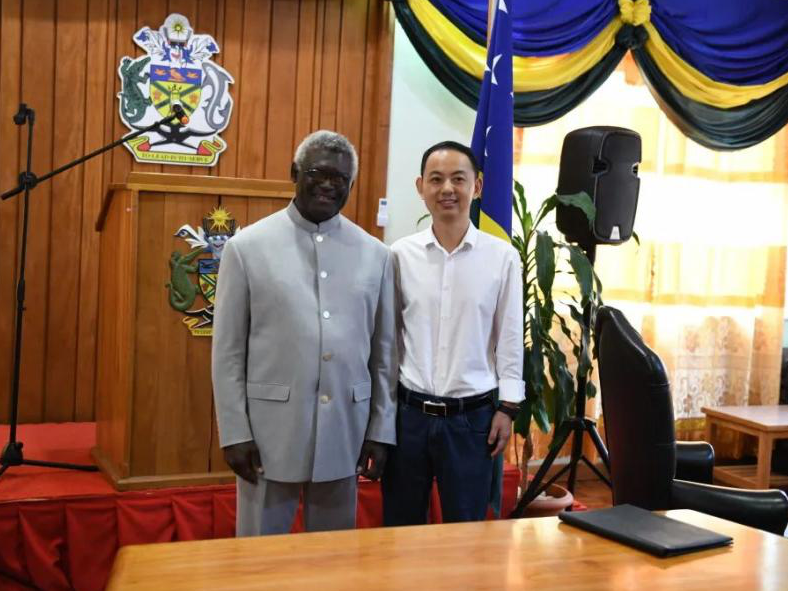 中南建筑设计院援所罗门群岛体育场项目管理组组长阮祥炬和索加瓦雷总理合影。通讯员供图