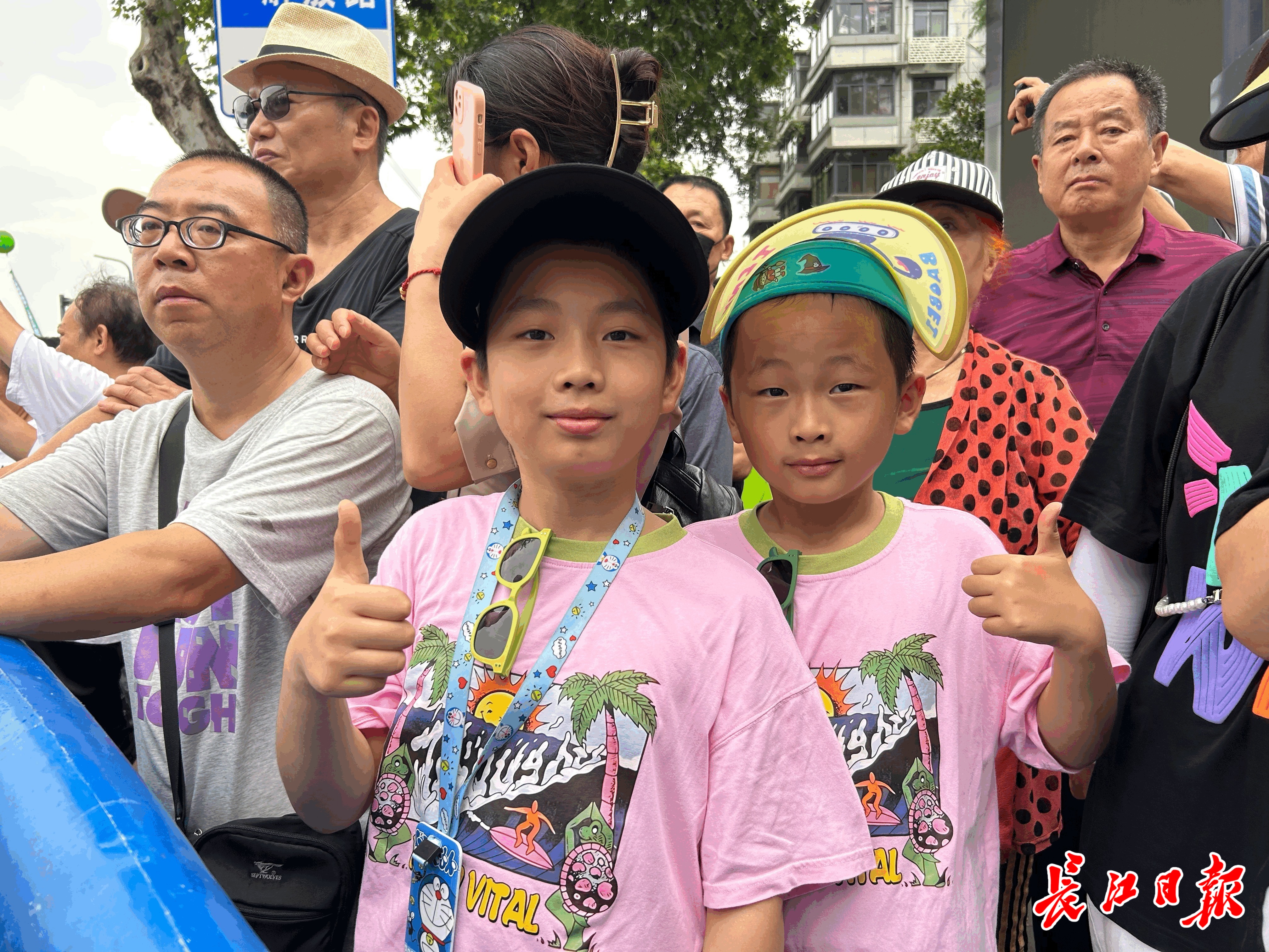 项浩铭今年12岁,项凯铭8岁,兄弟俩在学校听老师介绍渡江节后,就一直惦记着比赛当天前来观赛。项妈妈告诉记者,孩子作为土生土长的武汉人,在长江边长大,对江水很有感情,一到夏天就吵着到江边玩。但考虑到安全问题,她很少带孩子过来,只给他们报了游泳班。“虽然不能下水,但是让他们感受一下气氛也挺好。”