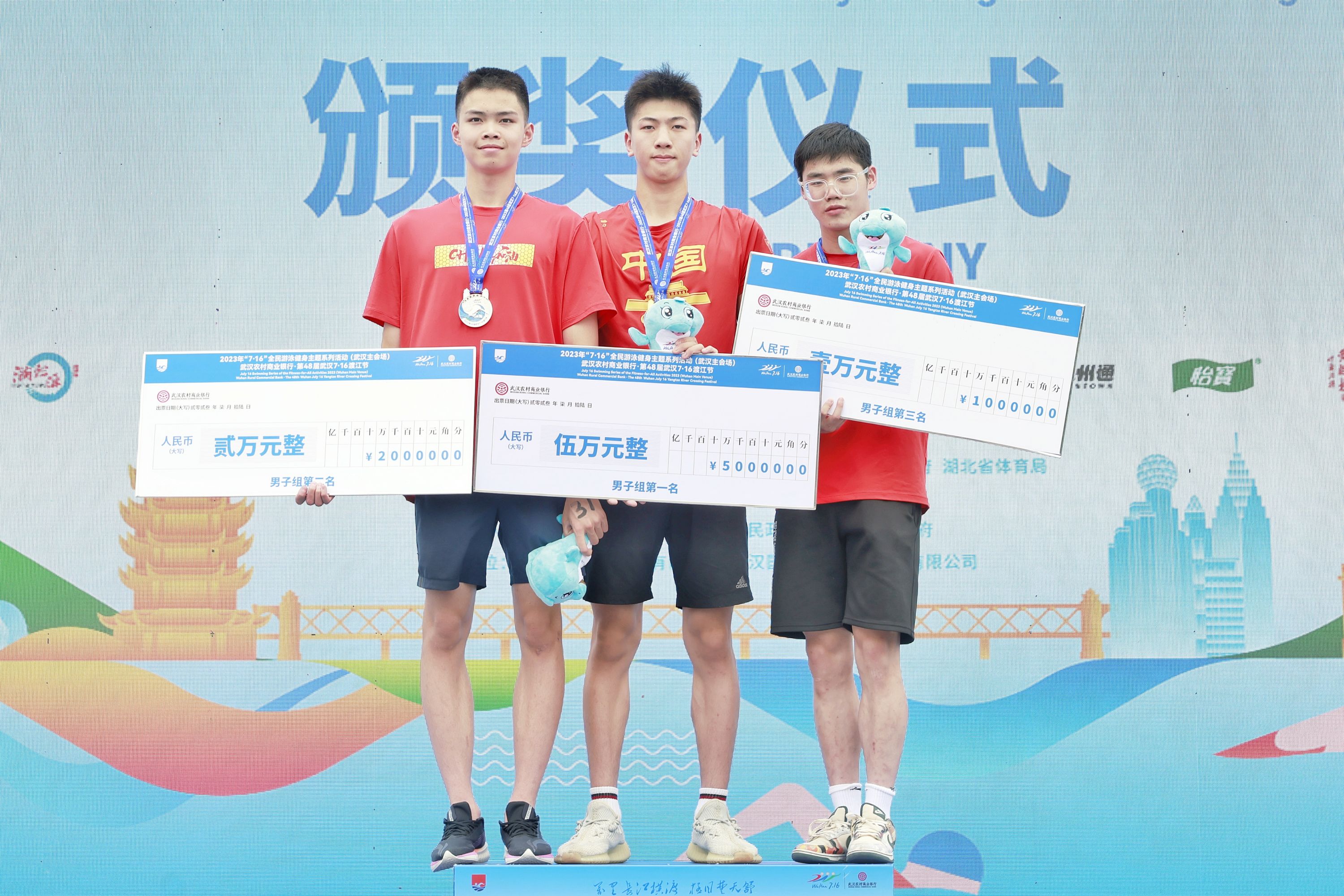 2023年武汉渡江节抢渡赛男子组前三名选手:第一名王宝骏(中),第二名徐海博(左),第三名陈鑫堃(右)。记者 胡冬冬 摄